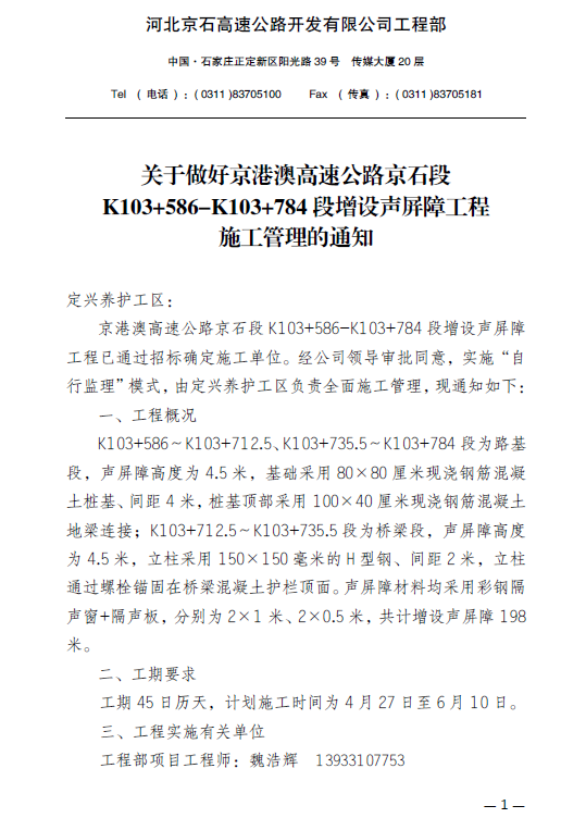 關(guān)于做好京港澳高速公路京石段K103 586_K103 784段增設(shè)聲屏障工程施工管理的通知