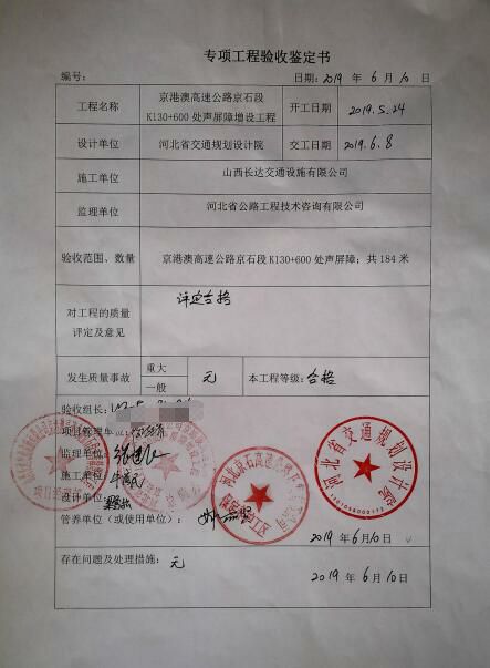 京港澳高速公路京石段K130+600處聲屏障增設(shè)工程專項(xiàng)工程鑒定書