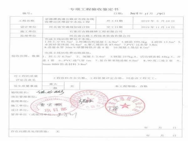京港澳高速公路京石段全線(xiàn)收費(fèi)站區(qū)增設(shè)中水池工程專(zhuān)項(xiàng)鑒定書(shū)