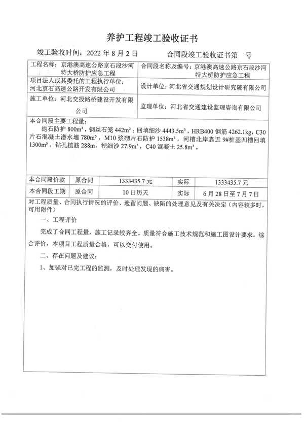 沙河特大橋樁基防護(hù)應(yīng)急工程驗(yàn)收證書