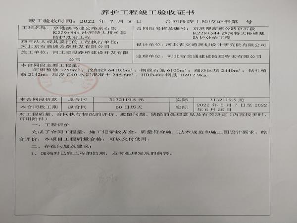 京港澳高速公路京石段沙河特大橋樁基防護處治工程驗收證書