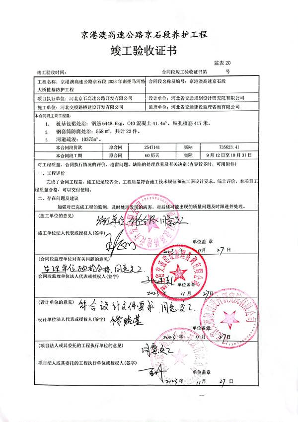 京港澳高速公路京石段2023年南拒馬河特大橋樁基防護工程驗收證書