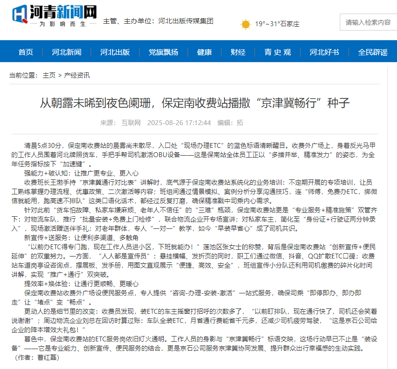 【河青新聞網(wǎng)】從朝露未晞到夜色闌珊,保定南收費站播撒“京津冀暢行”種子